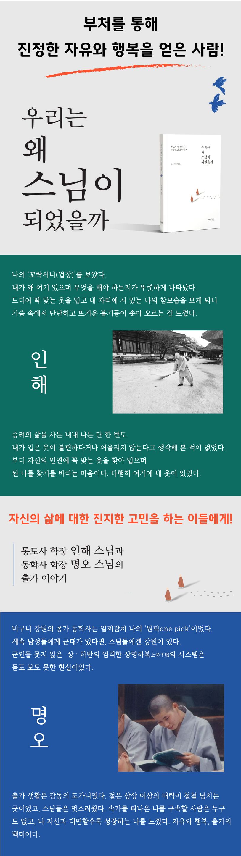통도사승가대학학장,인해스님의출가는‘나에게꼭맞는옷’이었다.맞춤옷을지어두고기다린듯이,옷감을잘재단해서첫단추를제대로끼워,스님에게아주잘맞는출가라는옷을입었다.인해스님은《우리는왜스님이되었을까》에서출가에대해서이렇게말했다.