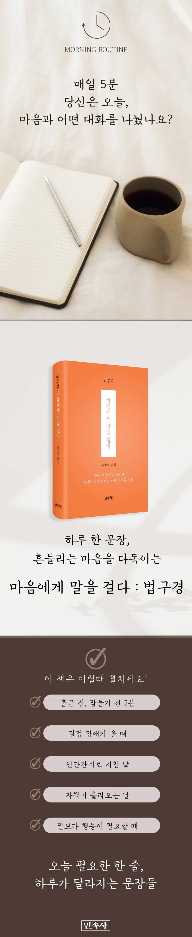 민족사가 펴낸 신간 《법구경 : 마음에게 말을 걸다》는 불교 최고의 명언집으로 불리는 『법구경(法句經)』의 423개 게송을 하루 한 문장씩 내 마음과 마주할 수 있도록 재구성한 감성 에세이이자 자기 돌봄 명상서다. 동시에 경전이면서 시집이고, 명언집이며, 명상 노트다. 무엇보다도 이 책은 ‘오늘의 언어로 내 마음을 비추는 거울’이라고 할 수 있다.