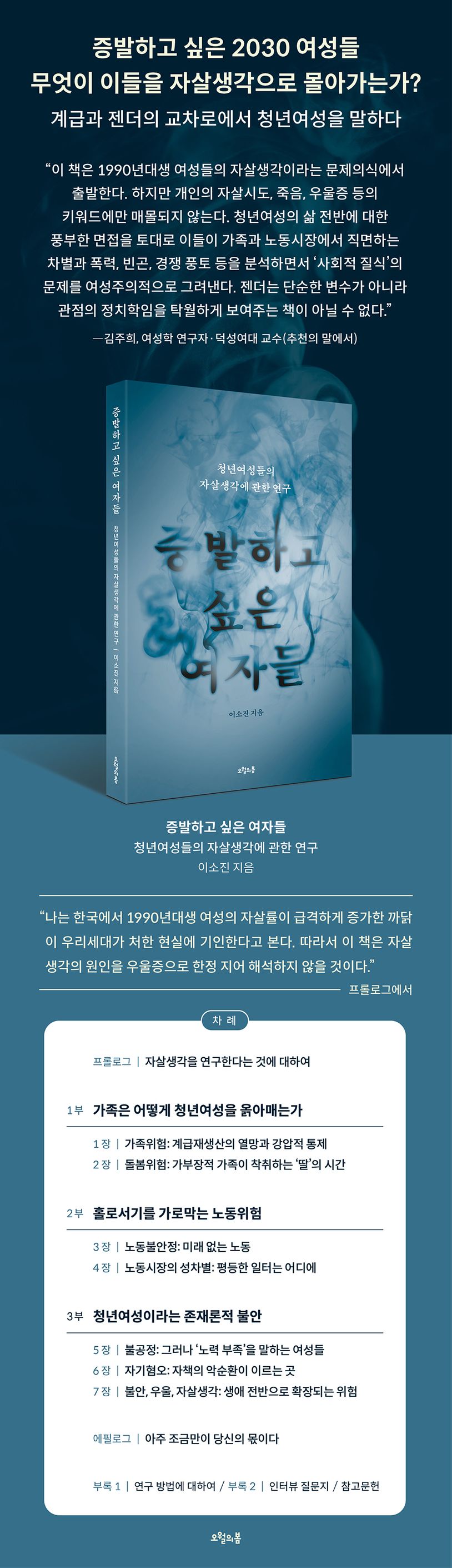 사회학연구자이소진은바로이러한상황,즉청년여성들의자살률이증가하는데문제의식을두고1년이상자살생각을하고있는청년여성들의이야기를듣고자했다.저자의관점은다음과같은말에서분명하게드러난다.“나는한국에서1990년대생여성의자살률이급격하게증가한까닭이우리세대가처한현실에기인한다고본다.따라서이책은자살생각의원인을우울증으로한정지어해석하지않을것이다.”(15쪽)그의말마따나이책은자살시도나우울증등‘개인’의문제에초점을맞추지않는다.그보다는청년여성들이가정에서,노동현장에서,사회에서마주하는억압과차별에주목한다.자신역시청년여성이자과거에자살생각을했던이로서가감없이그러한경험과입장을드러내는저자는책전반에서‘우리’를호명한다.비중산층-여성이라는,계급과젠더의교차로에선청년여성들이맞닥뜨리는‘생애위험’을가족위험,돌봄위험,노동위험으로분석해내며이러한위험들이청년여성의존재론적불안으로전환되는과정을드러내는이책은자살과자살생각의주요원인을개개인의사정이아닌사회적문제로전면화한다.