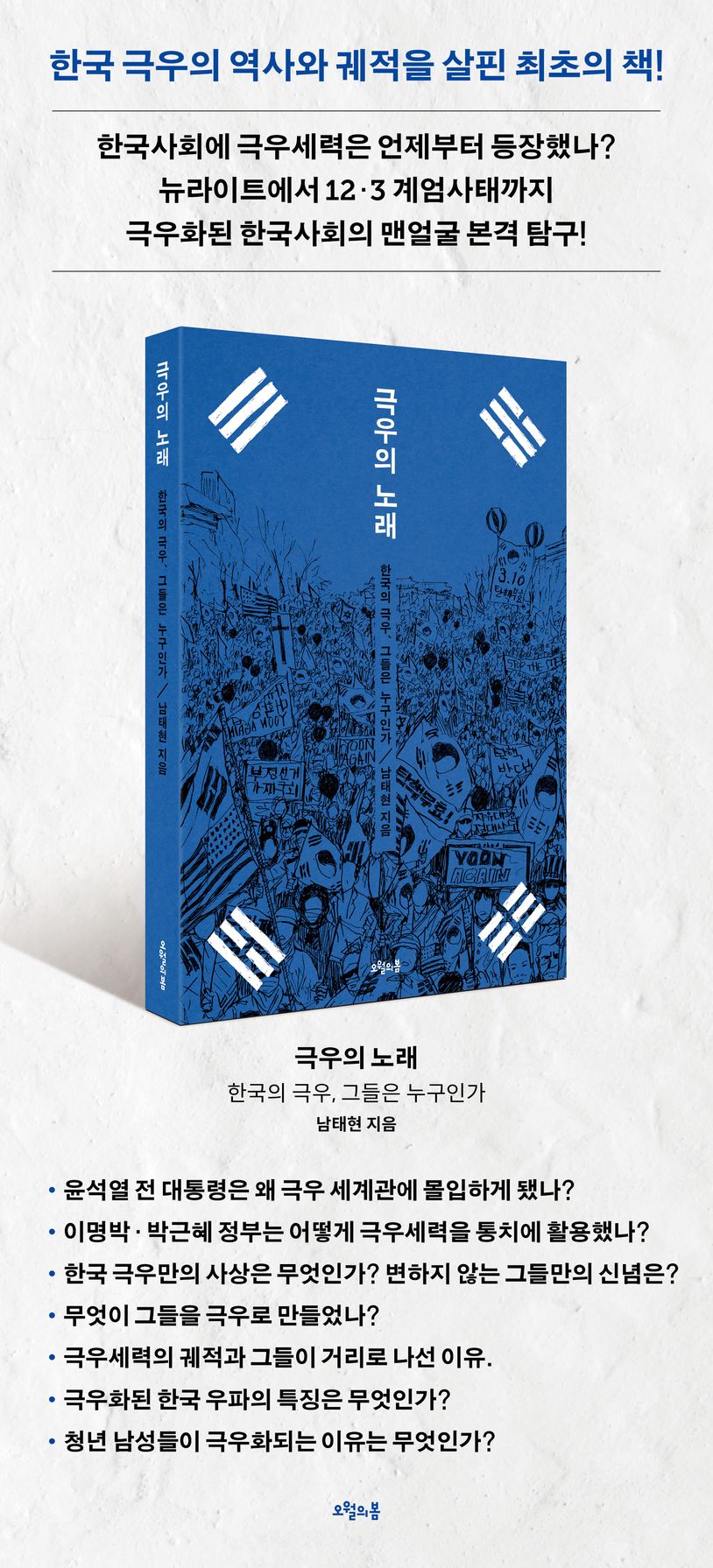 누가극우이고,극우의정의는무엇인가?저자는유럽에서번성하고있는극우와비교하며,‘태극기부대’를한국의극우라고칭한다.‘극우’란말그대로‘우파의극단적인모습’이다.우파는일반적으로자유시장경제,개인의자유,전통적가치를평가하고지키려는이들이다.극우는이에더해배타적민족주의,반엘리트주의,반국제화주의,그리고권위주의를옹호하고추구하는이들을가리킨다.지금프랑스,이탈리아,독일,헝가리,폴란드,미국등전세계에서이런극우의기세가만만치않다.