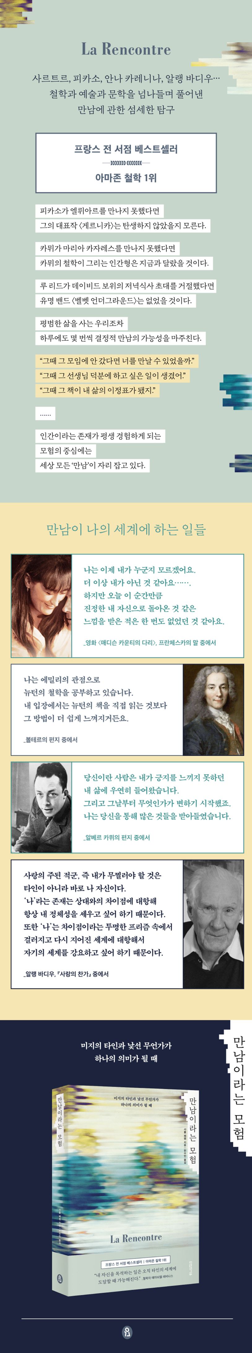 저자는 말한다. 만남은 우리 자신이 어떤 사람인지 드러내고 세상으로 향할 수 있도록 이끌어주는, 삶이라는 모험의 중심에 자리 잡고 있다고. 내가 나 자신과 만나기 위해서는 타인과의 만남이 반드시 필요하다. 진정한 나 자신이 되기 위해서는 내가 아닌 다른 존재와 만나야 하기 때문이다. 이 책을 통해 만남의 의미와 가치를 알아볼 수 있게 된다면, 우리는 지적인 자양분이 되어준 작품들을, 우리 일상의 크고 작은 인연들을 그리고 우리의 삶 그 자체를 지금까지와 다른 시선으로 보게 될 것이다.