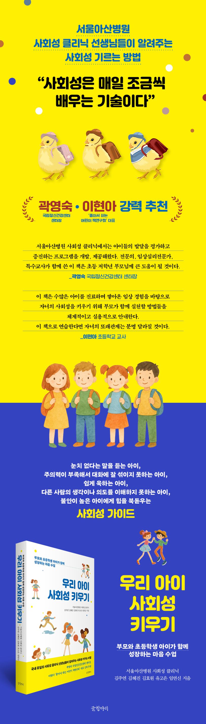 초등학교에 입학했거나 입학 예정인 자녀의 부모는 갖은 걱정에 시달린다. 아이가 친구를 못 사귀면 어쩌지, 선생님과 불화하면 어쩌지, 적응을 못 하면 어쩌지…… 여러 걱정을 모아보면 결국 한 가지다. ‘우리 아이의 사회성이 부족하면 어쩌지?’ 친구 없이 지내거나, 친구와 자주 다투고 괴롭힘 당하는 아이를 상상하면 불안이 앞선다. 아이의 사회성은 어떻게 키워줄 수 있을까? 아이의 첫 사회생활을 돕기 위해 부모는 무엇을 할 수 있을까?