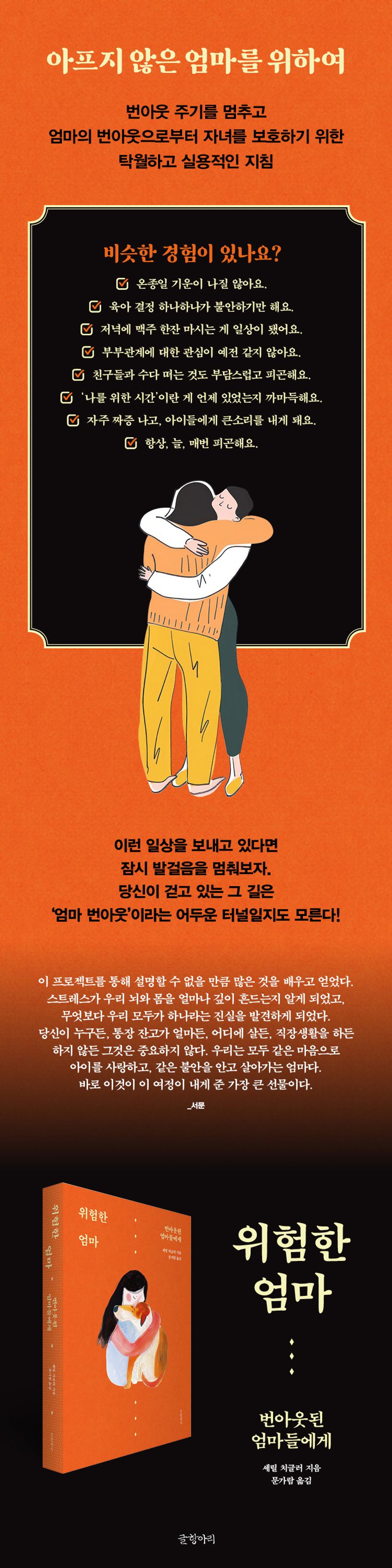 저자는 이런 한계 속에서 ‘엄마 번아웃’이란 개념을 제안한 인물이다. 20년 동안 1만 회 이상 상담을 진행해온 심리학자, 아동 연구로 학계에 발 들인 그가 엄마들의 이야기에 주목하게 된 이유는 간단하다. 아이의 내면에는 늘 부모의 흔적이 새겨져 있었기 때문이다. 행복하지 않은 아동 뒤에는 행복하지 않은 엄마가 있었다. 이런 통찰로부터 저자는 ‘엄마들의 문제를 정확히 파악한 뒤, 그것을 해결함으로써 아이들까지 행복하게 만드는’ 새로운 방식을 고안했다. 이 접근은 완벽히 먹혀들었고, NBC, CBS 방송과 『뉴욕타임스』 『타임』 지 기고, 그리고 「엄마들은 왜 비참한가」 TEDx 강연 등을 통해 뻗어나가며 전 세계 엄마들을 돕고 있다.
