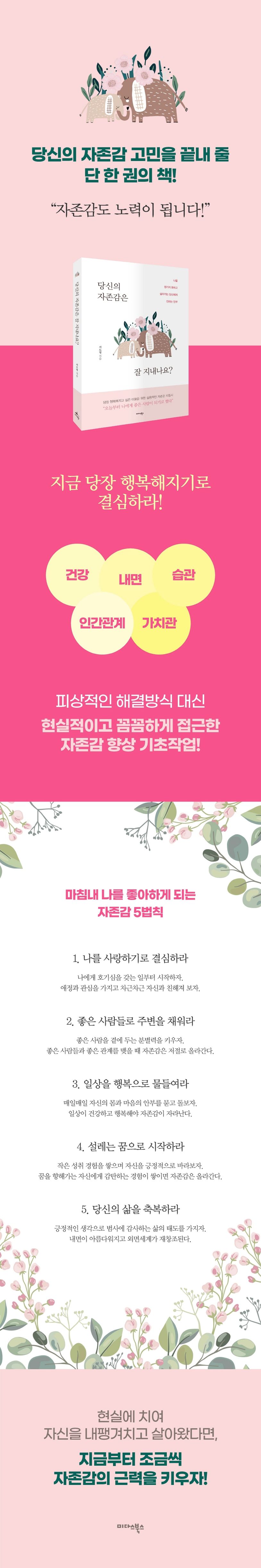 이 책에는 자존감이 중요한 이유, 자존감 도둑들과 단절하는 기술, 일상을 돌보는 방법, 자기 신뢰를 회복하는 방법, 건강한 삶의 태도가 차곡차곡 담겨 있다. 누구나 자존감을 위해 꾸준히 노력할 수 있다. 그 과정에서 자존감이 올라가는 선순환을 경험하게 될 것이다.