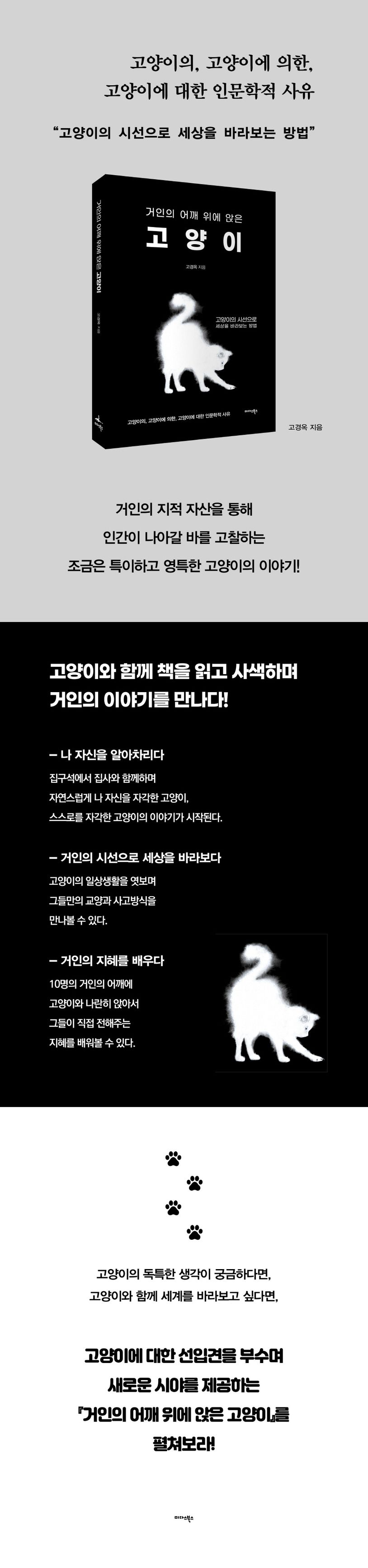 고양이에 대한 편견을 버리고 고양이와 함께 거인의 어깨 위에 앉고 싶다면, 보다 높은 눈높이에서 인간 세상을 바라보고 사유하고 싶다면 『거인의 어깨 위에 앉은 고양이』를 펼쳐 거인의 지혜를 배워라. 책을 덮는 순간 한층 더 깊어진 내면을 느낄 수 있을 것이다.