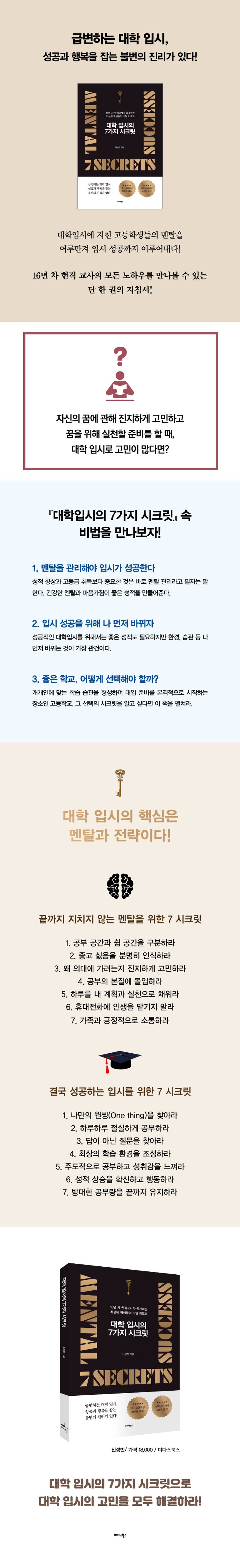 대학입시를 앞두고 갈팡질팡 헤매는 학생과 학부모를 위해 글을 쓰게 되었다고 밝힌 저자는 『대학입시의 7가지 시크릿』이 전국의 수많은 고등학생과 학부모님께 등대와 같은 책이 될 것이라고 말한다. 책의 마지막 페이지를 덮을 때쯤이면 학생들은 대학입시 성공을 위한 자기 공부 방향과 방법에 대한 확신을 얻을 수 있을 것이다. 물론 학부모 역시 급변하는 입시 환경에서 자녀에게 어떤 조언을 하고 어떤 행동을 취해야 할지 명확하게 깨달을 수 있을 것이다.