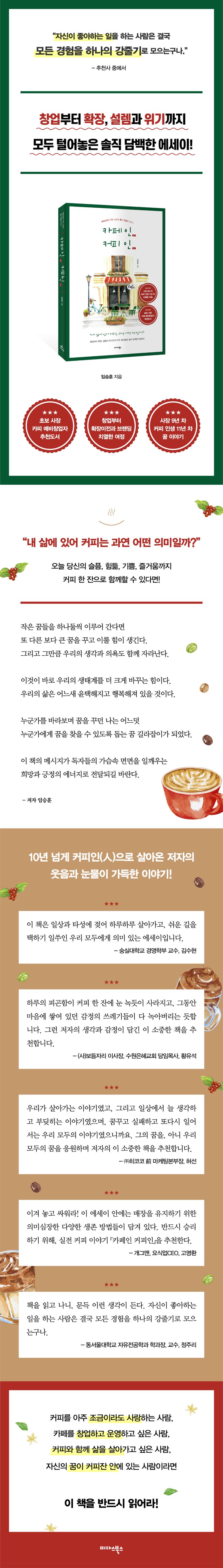 저자는 바리스타를 더 포괄적인 개념에서 커피인(人)으로 칭한다. 저자는 세상이 모든 사람을 기쁘게 해주는 ‘바리스타’라는 직업을 위해 달려왔고, 커피 전문가가 되어 성공적으로 카페를 운영해온 지금까지의 이야기를 책으로 썼다. 어떤 형태로든 커피인(人)을 꿈꾸는 사람들이라면 이 책을 통해 위로와 용기, 그리고 꿈을 향해 나아갈 힘을 얻을 수 있을 것이다. 동시에 우리가 평소에 쉬이 지나치는 동네 카페 사장님, 아르바이트생, 커피 취미인들의 꿈 이야기를 엿들을 수 있을 것이다.