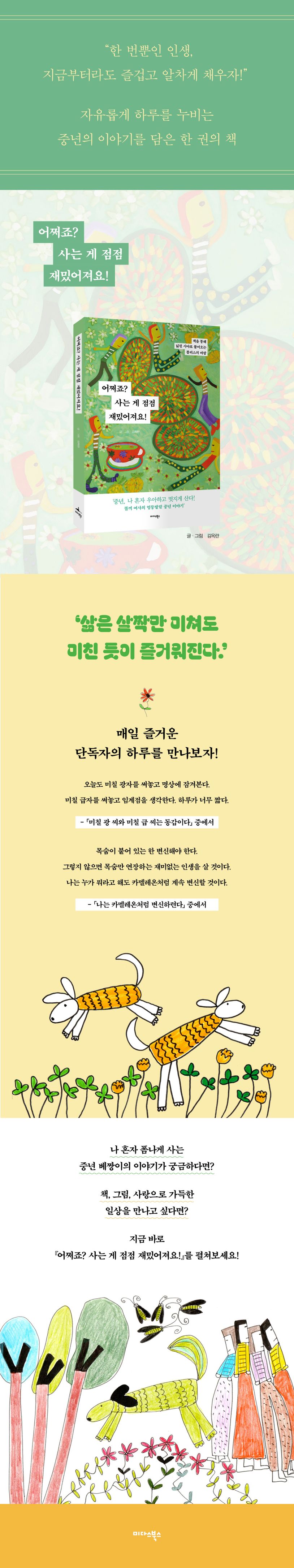 하지만 남들과는 사뭇 다른, 이 독특한 ‘똘끼’가 그 누구보다 우아하게 중년을 만끽하는 저자를 만들었다. 저자와 함께 삶을 누리고 싶다면? 책, 그림, 사람이 주는 위로에 흠뻑 빠져 보고 싶다면? 지금 바로 『어쩌죠? 사는 게 점점 재밌어져요!』를 펼치길 바란다. 이 한 권의 책이 기꺼이 당신의 내일에 긍정적인 에너지를 불어넣어 줄 것이다.