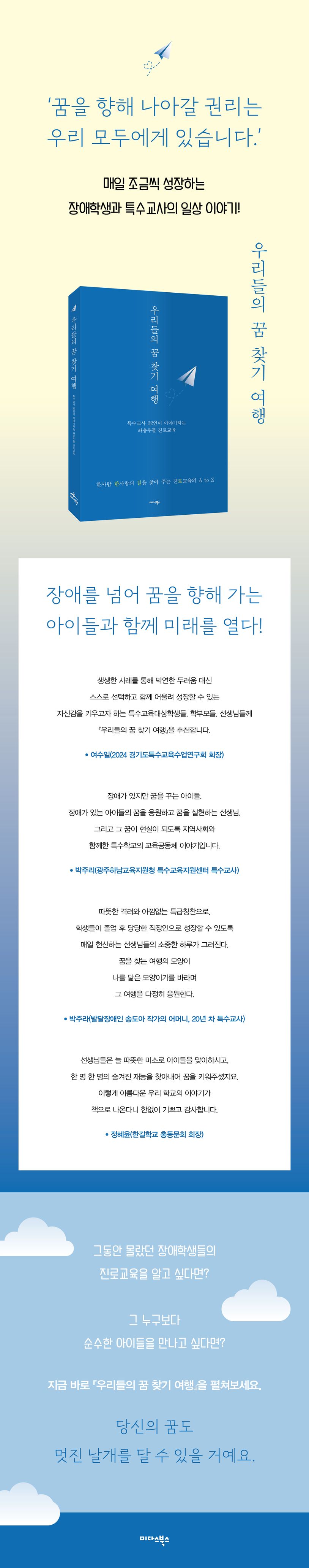특수교사 22인의 시선 끝에는 늘 자신만의 꿈과 미래를 만나기 위해 있는 힘껏 노력하는 학생들이 있다. 그동안 몰랐던 장애학생들의 진로교육을 알고 싶다면? 그 누구보다 순수한 아이들을 만나고 싶다면? 지금 바로 『우리들의 꿈 찾기 여행』을 펼치길 바란다.