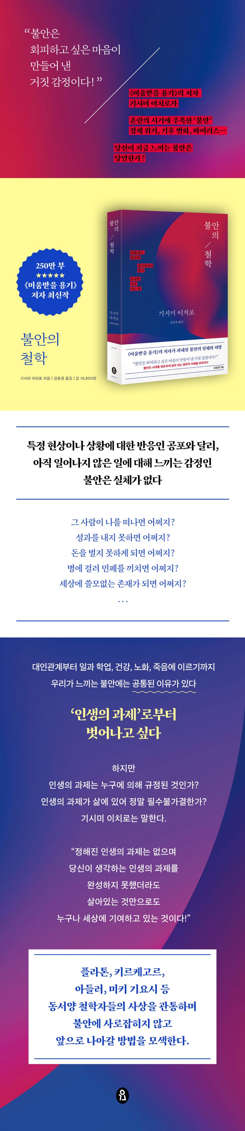 경제 위기, 기후 변화 등 시시각각 급변하는 불확실성의 시대에 살고 있는 우리는 누구나 불안을 느낀다. 특히 팬데믹 이후 최근에는 전 세계에 덮친 경제 위기로 지금까지 쌓아 왔던 것들이 한순간에 무너질 수 있다는 생각에 불안이 한층 심화하고 있다. 하지만 기시미 이치로는 지금이야말로 오히려 우리 안에 내재된 불안을 깨뜨릴 수 있는 기회라고 말한다.