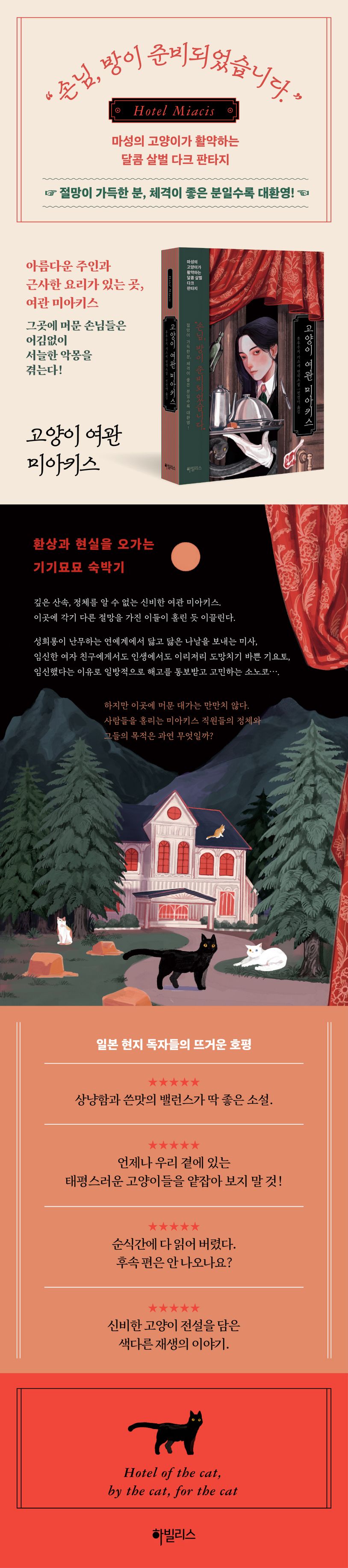 『고양이 여관 미아키스』는 일본 현지에서 18만 부 이상 판매된 야식 카페 시리즈 〈마캉 마랑〉 작가가 선보이는 다크 판타지다. 마성의 고양이가 활약하는 달콤하고도 살벌한 이야기. 이 책을 읽고 나면 우리 곁에 있는 태평스러운 고양이들이 조금 다르게 보일 수도 있다. 지금까지 보지 못했던 이 특별한 판타지는 올여름, 독자들에게 서늘한 감동을 선사할 것이다.