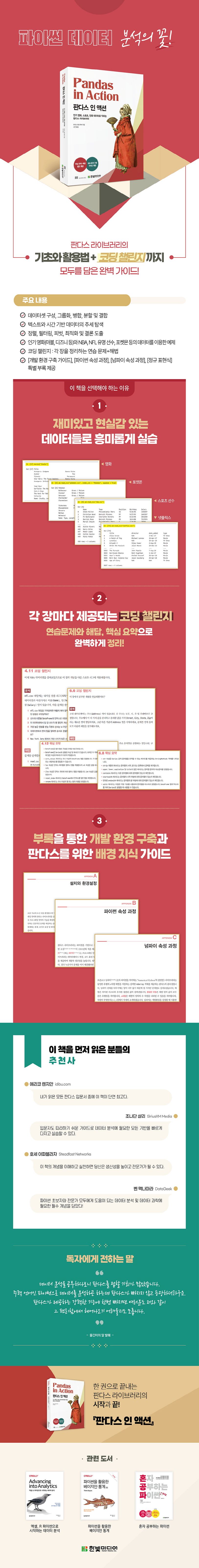 판다스는 파이썬의 데이터 분석 라이브러리로 수백만 행에 대한 작업을 빠르게 수행하고 파이썬 데이터 생태계의 다른 도구와 쉽게 호환되는 장점을 가졌다. 이 책은 마블과 디즈니의 인기 영화, 포켓몬, NBA와 NFL 유명 선수, 넷플릭스 등의 데이터로 판다스 라이브러리를 활용하여 파이썬 기반의 데이터 분석 방법을 소개한다. [개발 환경 구축 가이드], [파이썬 속성 과정], [넘파이 속성 과정], [정규 표현식] 등 알찬 내용의 부록으로 판다스가 부담스러운 초급자도 이 부록을 통해 빠르게 판다스를 시작할 수 있다. 그리고 각 장이 하나의 독립적인 튜토리얼과 같이 구성되어 있어 중급자 이상은 필요한 부분만 골라 학습할 수도 있다. 마지막으로 각 장 마지막에 제공되는 코딩 챌린지를 직접 해보며 실무 경험까지 챙길 수 있다. 처음부터 끝까지 확실하게 판다스를 가이드하는 이 도서로 판다스의 진정한 고수가 되어보자!