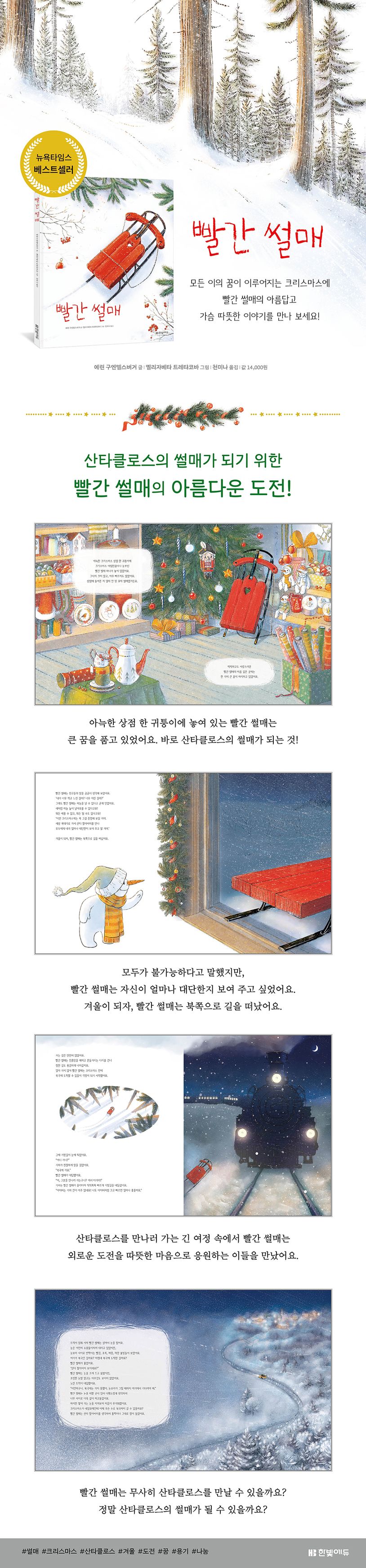 아늑한 상점 한 귀퉁이에 놓여 있는 빨간 썰매는 한 가지 큰 꿈을 간직하고 있었어요. 바로 산타클로스의 썰매가 되는 것이지요. 상점 안의 친구들은 하나같이 절대로 이루어질 수 없는 꿈이라고 말했어요. 하지만 빨간 썰매는 비록 너무 작고 느리고 어리지만, 꼭 꿈을 이룰 수 있을 거라고 굳게 믿었어요. 겨울이 되자 빨간 썰매는 북쪽으로 길을 떠났어요. 빨간 썰매는 산타클로스를 만날 수 있을까요? 정말 산타클로스의 썰매가 될 수 있을까요?