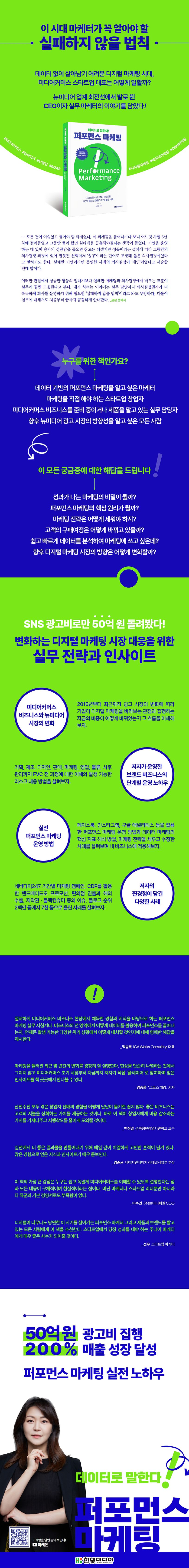 이 책은 빠르게 바뀌는 뉴미디어 업계 현장에서 발로 뛴 저자의 실전 경험과 노하우를 담았다. 미디어커머스 스타트업 대표인 저자는 제품의 기획부터 제조, 마케팅, 유통, 사후관리까지 비즈니스 전 과정에서 데이터를 어떻게 활용하여 성과를 끌어냈는지 실무적인 팁을 제공한다. 특히 퍼포먼스 마케팅을 활용한 다양한 마케팅 캠페인 사례와 페이스북, 인스타그램, 구글 애널리틱스 운영 방법을 다룬다. 이를 통해 향후 디지털 마케팅의 방향은 무엇인지, 변화하는 미디어커머스 시장에서 어떻게 마케팅 전략을 세우고 대응해야 하는지 그 해답을 찾을 수 있다.