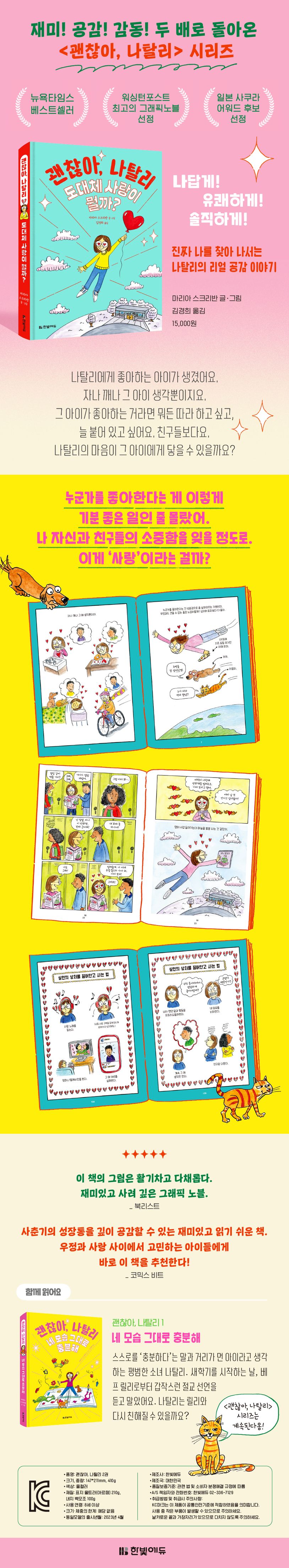사춘기 속으로 첫발을 뗀 ‘평범한 우리’의 이야기 〈괜찮아, 나탈리〉 시리즈는 베스트셀러 작가이자 인기 만화가인 마리아 스크리반의 첫 그래픽노블이에요. 출간 즉시 여러 매체에 소개되고, 뉴욕 타임스 베스트셀러로 선정될 정도로 많은 사랑을 받고 있어요.
