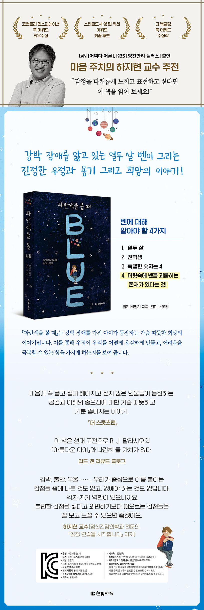 『파란색을 볼 때』는 강박 장애를 가진 아이가 등장하는 가슴 따듯한 희망의 이야기입니다. 이를 통해 우정이 우리를 어떻게 용감하게 만들고, 어려움을 극복할 수 있는 힘을 가지게 하는지를 보여 줍니다.