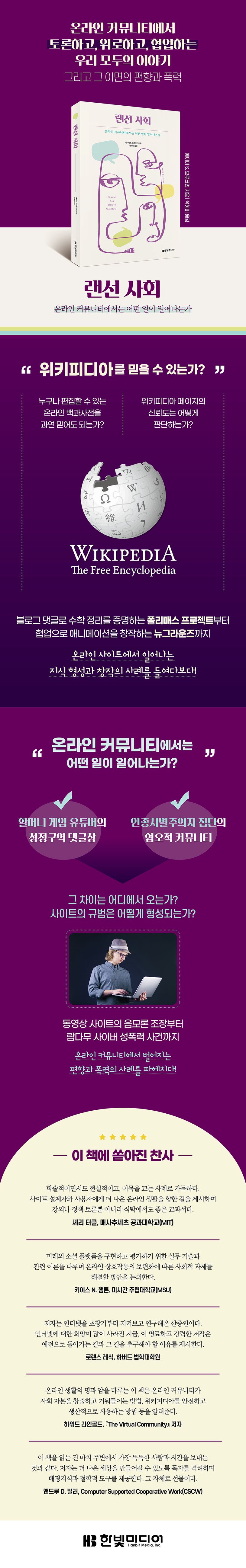 이 책은 인터넷 시대의 산증인인 에이미 S. 브루크먼의 30여 년 발자취를 따라 온라인 커뮤니티의 명과 암을 섬세하게 파헤친다. 그와 더불어 온라인에서 이루어지는 협업으로 어떻게 지식이 형성되는지 탐구한다. 지식이란 무엇일까? 온라인 정보 출처가 믿을 만한지는 어떻게 판단할까? 누구나 손쉽게 편집할 수 있는 위키피디아를 과연 믿어도 될까?