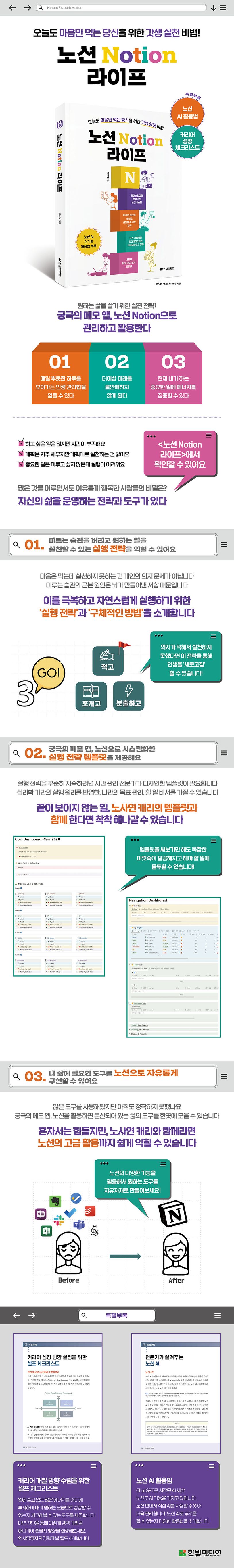 이 책은 ‘어떻게 하면 노션을 잘 다룰 수 있을까?’라는 질문의 답을 알려주지 않는다. 대신 ‘노션을 내 삶에 실제로 활용하는 방법’을 알려준다. 이 책의 저자 노사연 캐리는 오랜 기간 강의한 ‘인생 관리’ 주제를 노션으로 구현했다. 여기에 인간의 심리와 행동 이해를 기반으로 한 노션 템플릿을 설계하여 여러분이 하루하루 원하는 방향을 살 수 있게 도울 것이다.