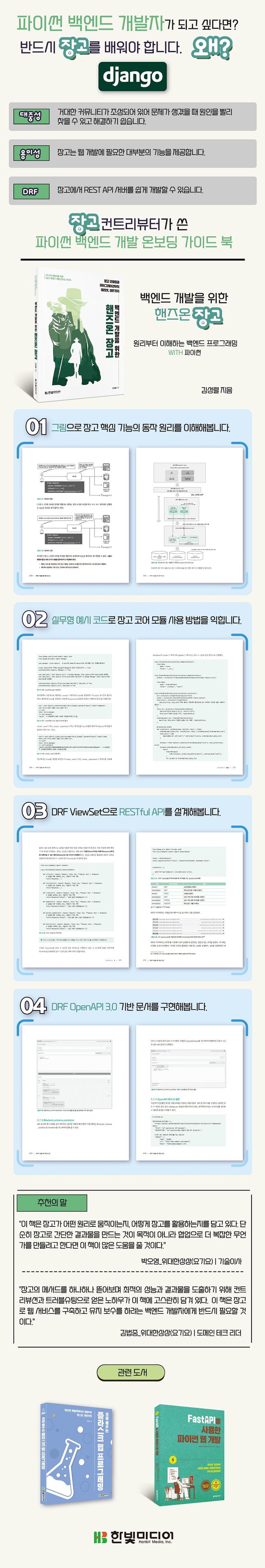 장고는 파이썬 웹 프레임워크이자 풀스택 프레임워크이다. 하지만 대부분의 웹 서비스는 프런트엔드와 백엔드를 분리해서 개발한다. 더욱이 리액트나 뷰 같은 훌륭한 프런트엔드 SPA 도구가 등장했고 DRF라는 강력한 장고 라이브러리가 있기 때문에 장고를 백엔드 개발 도구로 사용하는 것이 더 효과적이다. 이 책은 파이썬 백엔드 개발을 위한 장고의 핵심 개념을 다루고 있다. 실제 주니어 개발자가 궁금해하던 내용을 포함하여 백엔드 개발을 하기 위해 알아야 하는 CS 지식과 장고 코어 모듈을 입문자가 쉽게 이해할 수 있도록 설명한다. 또한 장고의 동작 원리와 구조를 정확하게 이해하는 데 도움을 주는 다양한 그림과 실무에서 활용할 수 있는 실습 코드를 수록했다.