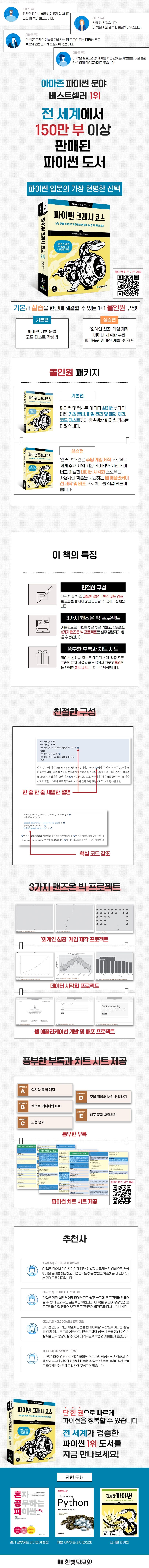 주요내용-파이게임,Matplotlib,Plotly,Django등강력한파이썬라이브러리와도구사용법-키입력,마우스클릭등점점어려워지는2D게임만들기-다양한데이터를이용해상호작용가능한시각화생성하기-웹애플리케이션을생성하고커스텀해서온라인에배포하기-프로그래밍실수와오류에현명하게대처하는법-깃을활용해효율적으로프로그램버전을관리하는법친절한제품설명서처럼파이썬의모든것을담은'파이썬사용설명서'수많은파이썬베스트셀러중에서세계적으로가장많이선택받은파이썬베스트셀러가실용적인구성으로다시태어났습니다.이책은파이썬초심자와중급자모두를만족시키는1+1구성으로초심자는기본편부터차근차근읽으며친절한설명과실습코드로자신의기본실력을쌓을수있고,중급자는실습편부터읽으며자신의코딩실력을향상시키고실무경험을빠르게얻을수있습니다.프로그래밍언어는직접무언가를만들며배우는것이가장좋습니다.이책은실습코드의구조와동작을정확히이해할수있게한줄한줄설명하고,이해한코드를바로코딩하며실전경험을쌓을수있도록많은연습문제가수록되어있습니다.또한,배웠던지식을리마인드할수있도록각장을요약정리한치트시트도추가로제공합니다.파이썬프로그래밍의시작과레벨업을위한모든방법이이책에담겨있습니다.전세계에서150만명이상이선택하고검증한이책으로여러분의파이썬시작과여행을더욱풍요롭게만드세요.