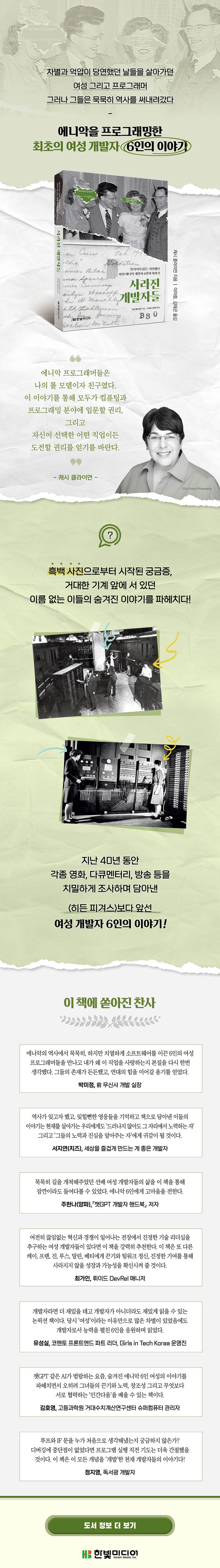 〈히든 피겨스〉보다 앞선 여성 개발자 6인의 생생한 이야기를 담은 이 책은 역사에서 사라진 여성 프로그래머들의 열정과 우정, 사랑을 섬세하게 표현해냈다. 1940년대, 차별과 억압이 당연했던 날들을 살아가던 여성이자 프로그래머 6인은 묵묵히 새로운 역사를 써내려갔다. 앞으로 영원히 회자될 에니악 6인의 이야기를 통해 현실을 마주할 수 있는 힘과 위로를 얻고, 세상을 살아가야 할 태도를 들여다보자.
