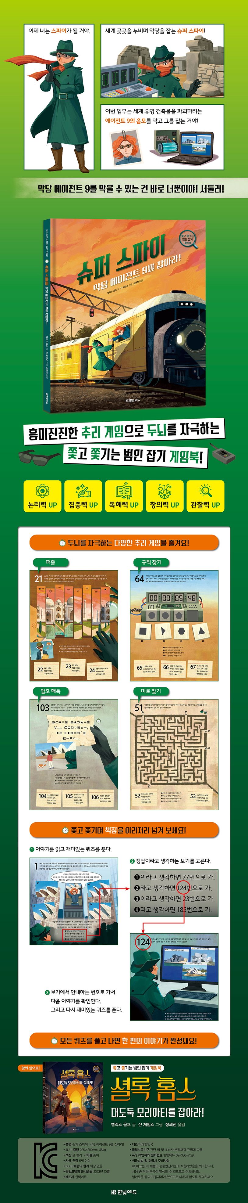 여러분은 세계 곳곳을 누비며 악당을 잡는 슈퍼 스파이가 될 거예요. 여러분의 임무는 에이전트 9의 음모를 막고, 그를 잡는 거지요. 여러분은 초보 스파이인가요, 경력 스파이인가요, 아니면 진정한 달인인가요? 난이도를 선택한 다음, 관찰력, 논리력, 사고력을 발휘해서 흥미진진한 추리 게임을 해 보세요! 쫓고 쫓기며 범인을 잡다 보면 어느새 똑똑해져 있을 거예요.