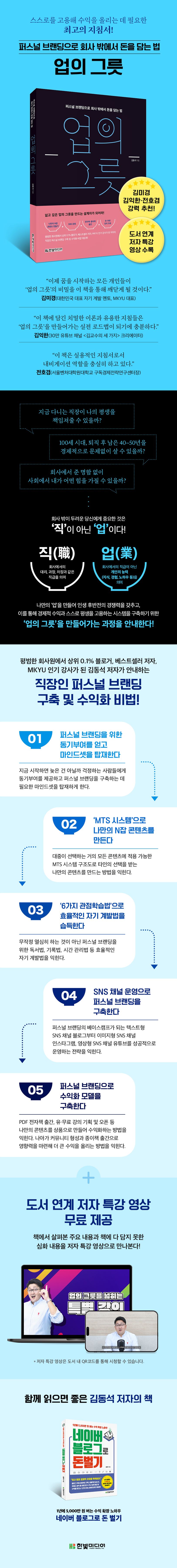 ‘직업(職業)‘이라는 단어에서 ‘직(職)‘은 회사에서의 대리, 과장, 차장과 같은 직급을 의미하고, ‘업(業)’은 회사 내의 직책이 아닌 개인의 능력(지식, 경험, 노하우 등)을 의미한다. 이 책은 나만의 ‘업’을 만들어 인생 후반전의 경쟁력을 갖추고, 이를 통해 경제적 수익과 스스로 평생을 고용하는 시스템을 갖추기 위한 ‘업의 그릇’을 만들어가는 과정을 담았다.