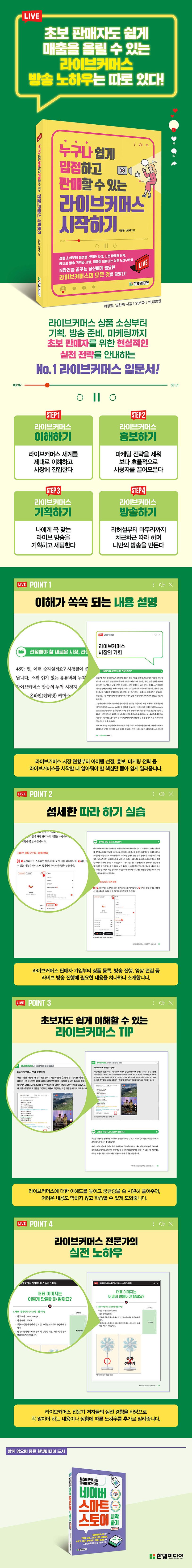 그동안 라이브커머스는 많은 변화와 발전이 이루어졌고 빠르게 성장하며 안정기에 접어들었다. 라이브커머스는 2023년 거래액 3조 원을 돌파하면서 명실공히 주요 유통 방식의 하나로 자리 잡아가고 있다. 이 책은 라이브커머스에 관심을 가지고는 있지만 무엇부터 시작해야 할지 몰라 막막한 사람들에게 유용한 가이드를 제공한다. 반짝 유행을 타는 책이 아니라, 누구나 쉽게 입점하고 판매할 수 있는 라이브커머스 입문서로 자리할 수 있도록 라이브커머스 시장의 흐름과 변화를 세세하게 담았다.