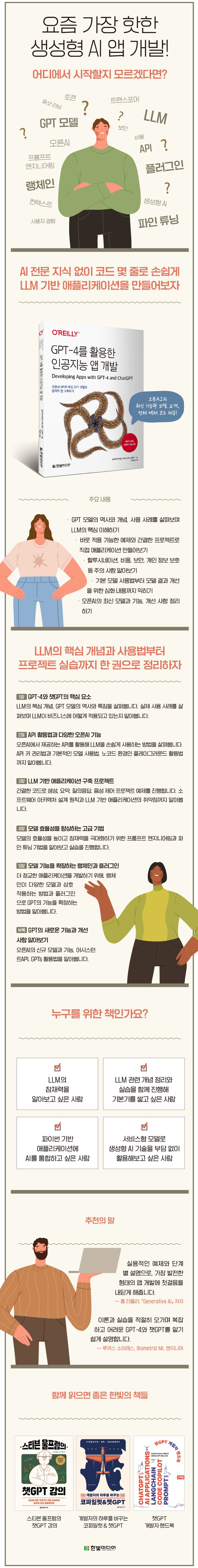 실습으로 뉴스 기사 생성, 유튜브 동영상 요약, 닌텐도 게임 〈젤다의 전설〉 질의응답 봇 구축 등 흥미로운 프로젝트를 진행하며 직접 LLM 기반 앱을 구축해본다. 이 과정에서 보안과 데이터 개인 정보에 대한 고려 사항뿐 아니라 프롬프트 엔지니어링, 파인 튜닝, 랭체인 등 고급 주제를 폭넓게 다룬다.