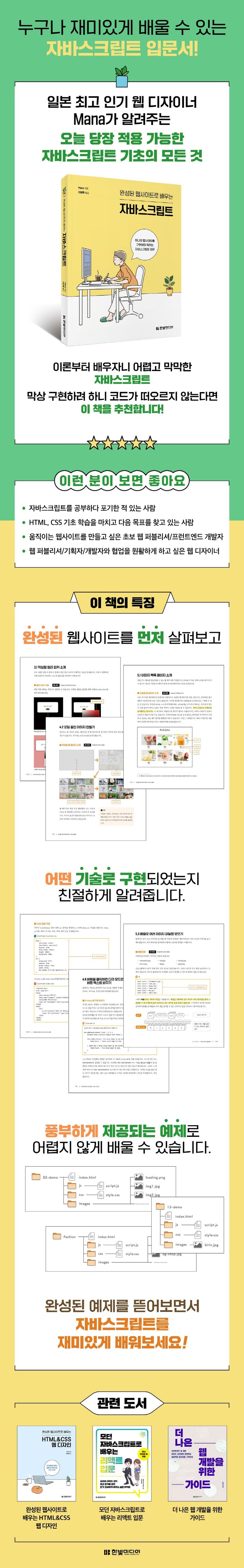 아무리 디자인을 잘해도 자바스크립트를 제대로 활용하지 못한다면 표현하고자 하는 웹사이트를 만들기 어렵습니다. 사용자와 전하고자 하는 콘텐츠에 따라 그에 맞는 디자인과 기능을 더해야 하는데 이때 필요한 것이 바로 자바스크립트이기 때문입니다. 하지만 자바스크립트를 이론부터 배우기 시작하면 어렵고 막막할 수 있습니다. 프로그래밍을 하다 보면 어떤 기능을 어떻게 구현해야 하는지 잘 떠오르지 않기도 합니다. 이 책에서는 이미 완성된 웹사이트를 기반으로 자바스크립트의 중요한 개념과 기능을 차근차근 설명합니다. 따라서 어떤 기능이 어떻게 활용되는지 쉽게 익히고 오늘 당장 나만의 웹사이트를 만드는 데 활용할 수도 있습니다. 자바스크립트를 처음 배운다면, 배우다가 포기했다면 이 책으로 시작해보세요!