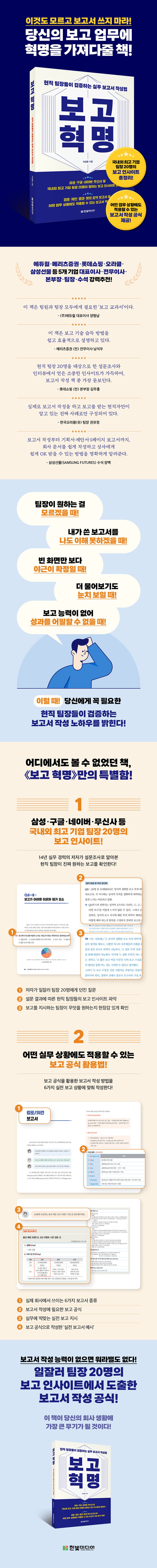 이 책은 어디에서도 볼 수 없었던 국내외 최고 기업 팀장 20명을 대상으로 한 설문조사와 인터뷰 콘텐츠를 제공한다. 저자 개인의 의견만으로 책이 구성된 게 아니라 일잘러 팀장 20명의 보고 인사이트까지 제대로 반영했다. 따라서 이 책의 독자는 실무에서 어떤 팀장을 만나도 한 번에 통과되는 보고서를 쓸 수 있게 될 것이다.