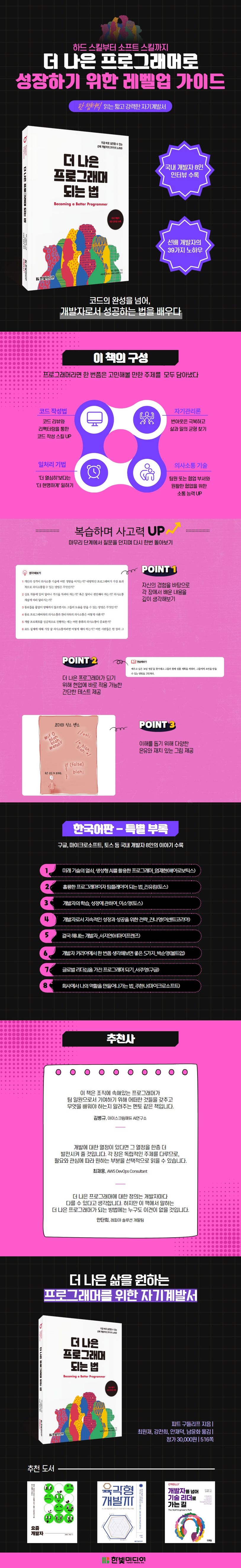 개발자의 일과 삶 전반에 걸친 실용적인 조언을 제공하는 이 책은, 신입 개발자나 경험 많은 개발자, 취미로 개발을 공부하는 일반인까지 누구에게나 도움이 될 것이다. 더불어 현업에서 활약하는 국내 개발자 8인의 인터뷰를 특별 부록으로 담아 그들의 경험담과 함께 현실적인 조언도 함께 얻을 수 있다. 이 책을 통해 더 높은 수준의 전문성과 역량을 갖춘 프로그래머로 성장할 수 있기를 바란다.