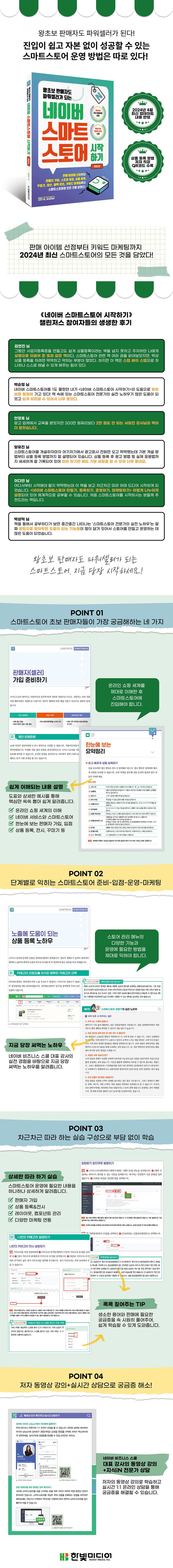 이 책은 스마트스토어를 시작하고 싶은 초보 판매자가 꼭 알아두어야 할 온라인 사업에 대한 이해, 판매 아이템 선정, 스마트스토어 개설, 입점, 상품 등록, 스토어 꾸미기, 정산, 혜택 관리 등 스마트스토어 운영에 대한 모든 것을 하나도 빠트리지 않고 꼼꼼히 담았습니다. 더 나아가 판매와 직결되는 키워드, 상위노출, SNS 연동 마케팅 등 실전 가이드를 제공해 초보 판매자가 성공하는 파워셀러가 될 수 있도록 도와줄 것입니다. 그뿐만 아니라 2024년 4월 개편된 최신 메뉴의 스마트스토어를 공부하기에 가장 적합한 책입니다.