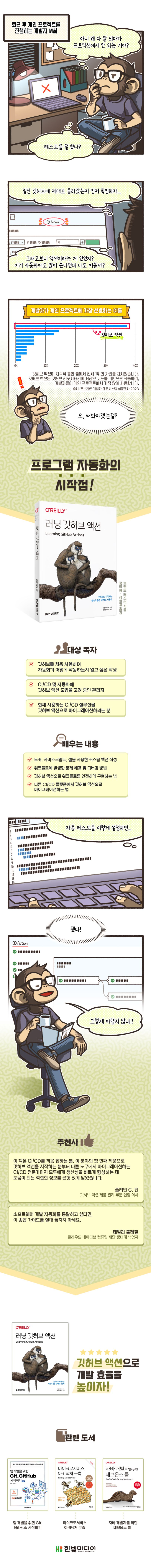 깃허브 액션을 활용해 개발 시간을 단축하고 협업 효율을 높이세요! 오픈 소스 작가이자 트레이너, DevOps 디렉터인 저자가 완벽한 깃허브 사용법을 설명합니다. 액션과 워크플로가 무엇인지, 이를 프로세스에 통합해 개발 과정을 단순화, 표준화, 자동화하는 방법은 무엇인지 알아봅시다. 깃허브 액션으로 코드 유효성 검사부터 복잡한 배포 파이프라인까지 구현하세요. CI/CD를 처음 접하는 분부터 깃허브 액션 사용을 고민했던 개발자까지 프로젝트에 바로 적용할 수 있는 실무 중심의 내용을 담았습니다. 이제 깃허브 액션으로 개발 프로세스를 혁신하세요!
