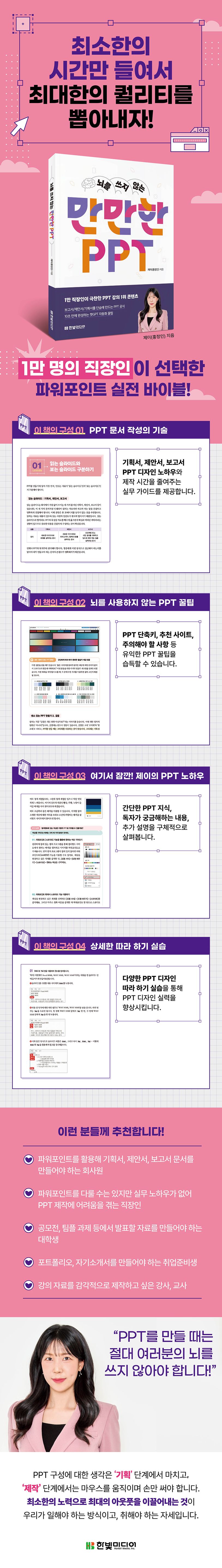 이 책은 결과물이 한눈에 들어오면서도 상대방을 설득할 수 있는 PPT를 최단 시간에 만드는 방법을 알려준다. 자신이 원하는 바를 논리적으로 설명하여 상대방으로부터 얻어내는 것이 PPT의 본질이다. 이를 달성하기 위해 저자가 수년간 현업에서 익힌 효율적인 PPT 기획 방법부터 오랜 강의를 거치며 갈고닦은 PPT 제작 스킬, 실전에서 200% 활용 가능한 PPT 디자인 꿀팁까지 이 책 한 권에 아낌없이 모두 모아놓았다. 더불어 신입 사원도 쉽게 따라 하는 챗GPT 자동화 필살기까지 알차게 소개한다. 지금부터 차근차근 책장을 넘기며 PPT를 따라 만들어보자. 하나하나 실습을 하다 보면 어느덧 뇌를 쓰지 않고 PPT를 뚝딱 만드는 일잘러로 거듭나있을 것이다.