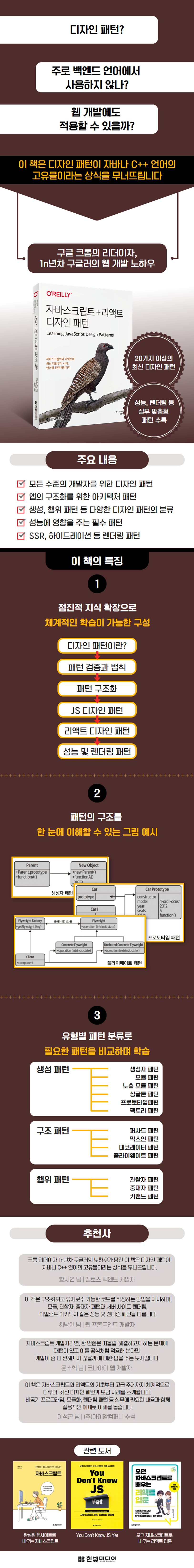 유지보수가 쉬운 구조적인 코드를 만들고 싶은가요? 최신 웹 개발 모범 사례를 참고하고 싶은가요? 그렇다면 『자바스크립트 + 리액트 디자인 패턴』이 해답입니다. 이 책은 모듈, 믹스인, 관찰자, 중재자 패턴을 포함한 최신 디자인 패턴을 자바스크립트와 리액트에 적용하는 방법을 소개합니다. 그리고 코드 스플리팅, 서버 사이드 렌더링 등 실무에 필요한 성능과 렌더링 관련 내용을 실용적인 예제와 함께 설명합니다. 또한, 여러 안티 패턴도 함께 다루고 있어 웹 개발을 할 때 흔하게 발생하는 실수를 줄이는 노하우까지 배울 수 있습니다. 이 책에 담긴 20가지 이상의 디자인 패턴을 익혀 더 나은 웹 개발자에 한 걸음 더 다가가세요.