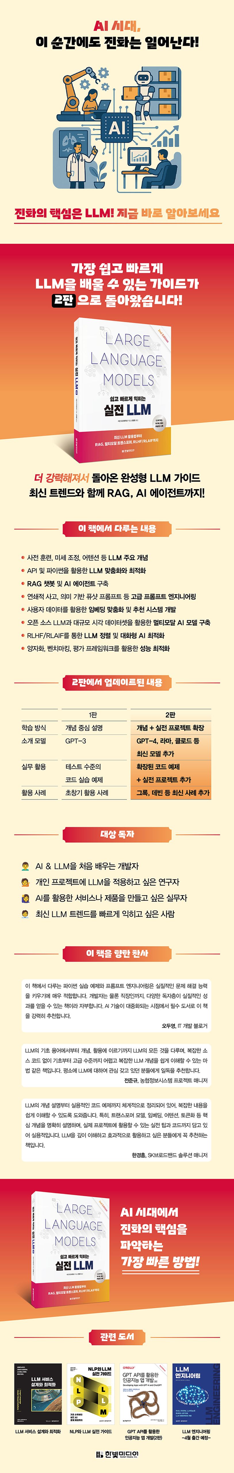 이 책은 LLM 개발 단계별 가이드, 모범 사례, 실제 사례 연구, 실습 예제를 통해 LLM이 생소했던 사람도 당장 개발을 시작할 수 있을 만큼 LLM에 대한 전반적인 지식을 쉽고 친절하게 설명합니다. 또한, LLM을 현업에서 최적화하고 배포하는 실무적인 내용까지 다루어, 입문자부터 전문가까지 폭넓게 활용할 수 있는 완성형 가이드입니다.