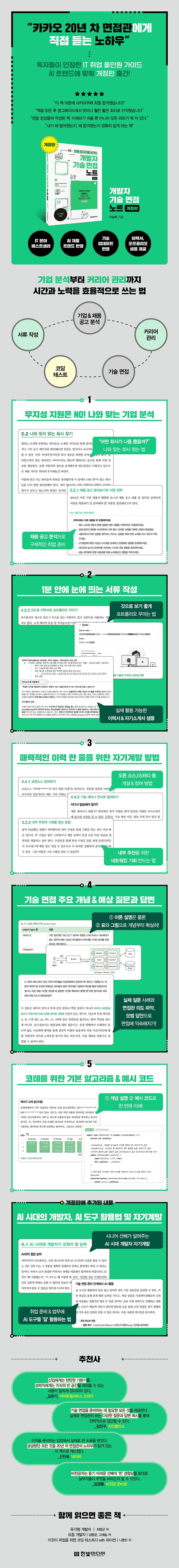 이 책은 저자가 직접 SI 업체에서 빅테크 기업으로 이직한 경험과 쿠팡과 카카오 면접관으로 임하며 쌓은 인사이트를 바탕으로 IT 기업 취업과 이직 전략을 상세하게 다룬다. 면접관 입장에서 숙지했으면 하는 지식과 정보를 카테고리별로 정리했다. 각종 서류 작성 노하우는 물론 실제 면접 질문과 답변 사례를 통해 자연스럽게 필수 알고리즘과 자료구조, 대용량 데이터 처리 기법 등 핵심 개념을 습득할 수 있다. 또한 AI 트렌드에 맞춘 채용 공고 분석 및 커리어 관리법, AI 도구를 업무에 활용하는 방법을 구체적으로 안내한다. 신입에게는 탄탄한 기본기를, 경력직에게는 지식의 빈 공간을 채워주는 이 책으로 보다 현명한 취업/이직 전략을 세워보자.