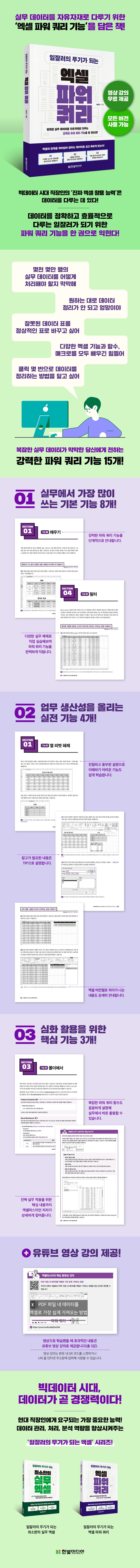 이 책은 방대한 실무 데이터를 쉽고 빠르게 다룰 수 있도록 돕는 강력한 도구 ‘파워 쿼리’를 체계적으로 알려준다. 파워 쿼리는 표 형태의 데이터를 연결하고 변환하는 데 특화된 도구로, 다양한 소스의 데이터를 실시간으로 연결해 클릭 몇 번으로 데이터를 정리할 수 있다. 다양한 실무 밀착 예제를 바탕으로 엑셀 모든 버전에서 파워 쿼리를 학습할 수 있으며, 무료 유튜브 동영상 강의(총 5강)까지 제공한다.