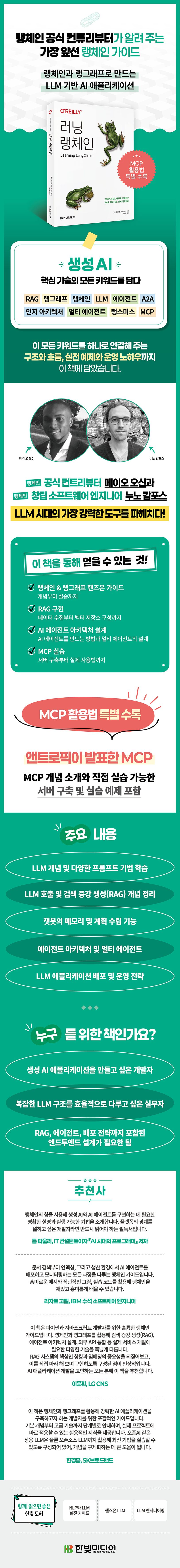 이 책은 LLM 기반 애플리케이션 개발의 효율을 극대화하는 랭체인과, 복잡한 아키텍처 설계를 가능하게 하는 랭그래프를 중심으로, 기초 개념부터 실전 배포·운영까지 전 과정을 체계적으로 안내합니다.