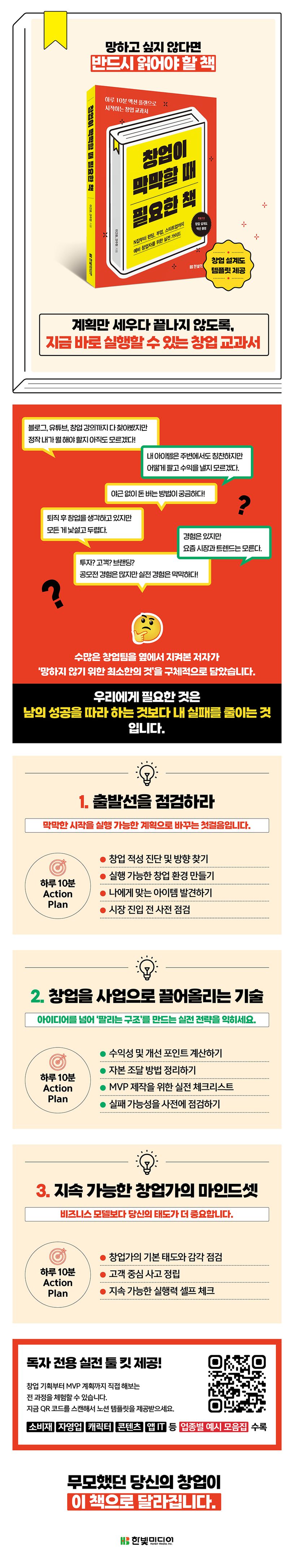 《창업이 막막할 때 필요한 책》은 ‘머릿속은 가득 차 있는데 실행은 어려운’ 예비 창업자들을 위한 실전창업 안내서입니다. 하루 10분씩 따라 할 수 있는 [Action Plan]을 구성하여 창업의 아이디어 발굴부터 수익성 점검, 자본 조달, MVP 제작, 브랜딩, 실행 마인드셋까지 전 과정을 단계별로 안내합니다. 특히 저자는 수많은 창업팀을 옆에서 지켜보며 실패한 창업을 분석해 ‘망하지 않기 위해 반드시 점검해야 할 것들’을 구체적으로 담았습니다. 내 사업을 꿈꾸는 대학생부터 부업과 N잡을 구상하는 직장인, 4050 경력 전환자, 어쩔 수 없이 창업을 해야 하는 분 등 다양한 처지의 창업 준비자들에게 ‘내 상황에 맞는 창업 전략’을 제시하며, 허무맹랑한 성공담이 아닌 현실에서 진짜 창업을 설계할 수 있도록 도와줍니다.