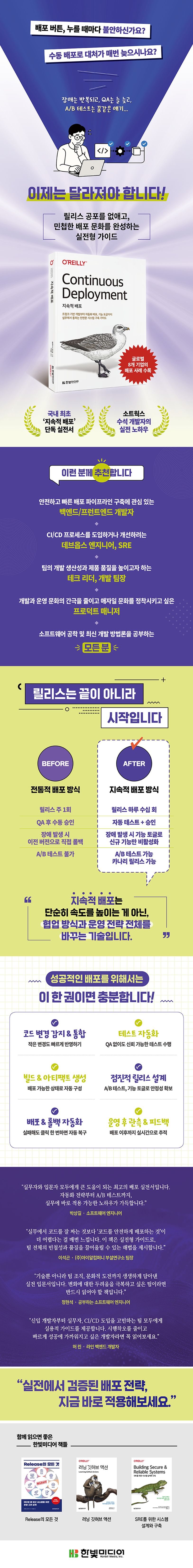 [PART1지속적배포]CHAPTER01지속적배포_1.1수개월,수년마다한번배포_1.2며칠마다한번배포_1.3지속적배포_1.4익스트림프로그래밍_1.5데브옵스_1.6지속적통합_1.7지속적전달_1.8최종프로덕션게이트_1.9시사점_1.10지속적배포는위험한가?_1.11정리하기CHAPTER02이점_2.1원피스플로와린생산_2.2DORA메트릭_2.3품질시프트레프트_2.4정리하기CHAPTER03사고방식의전환_3.1변경사항을정의하는것과적용하는것_3.2진행중인작업숨기기_3.3분산시스템_3.4프로덕션경로간의계약_3.5배포는릴리스가아니다_3.6엔드투엔드전달라이프사이클_3.7정리하기CHAPTER04최소요건_4.1자율적다기능팀_4.2이해관계자의신뢰_4.3정리하기CHAPTER05도전과제_5.1배포에민감한시스템_5.2유저설치소프트웨어_5.3규제대상산업_5.4인지부하_5.5정리하기[PART2개발이전]CHAPTER06예정된작업나누기_6.1수평분할vs수직분할_6.2지속적배포를하면_6.3효과적인수직분할_6.4예제:그로서루_6.5정리하기CHAPTER07프로덕션빌드_7.1배포성요건_7.2테스트성요건_7.3관찰가능성요건_7.4보안요건_7.5성능요건_7.6(좀더)완전한유저스토리템플릿_7.7예제:그로서루유저스토리에CFR추가_7.8정리하기[PART3개발단계]CHAPTER08플랫폼아키텍처재구축_8.1유저스토리_8.2그로서루애플리케이션_8.3정리하기CHAPTER09라이브기능리팩터링_9.1해야할일_9.2상품식별체계_9.3현재상태_9.4목표상태_9.5어떻게목표를달성할까?_9.6확장/축소구현_9.7정리하기CHAPTER10데이터와데이터손실_10.1해야할일_10.2현재상태_10.3목표상태_10.4어떻게목표를달성할까?_10.5이중쓰기구현전략_10.6이중읽기구현전략_10.7NoSQL_10.8정리하기[PART04개발이후]CHAPTER11프로덕션에서테스트_11.1왜프로덕션에서테스트를해야하나?_11.2어떻게프로덕션에서테스트를할까?_11.3스테이징이후의스토리_11.4정리하기CHAPTER12릴리스_12.1안티패턴:빅뱅릴리스_12.2안티패턴:부분배포로일부만릴리스_12.3릴리스에기능토글응용_12.4카나리릴리스_12.5A/B테스트_12.6정리하기[PART05사례연구]CASESTUDYA오토스카우트24_A.1오토스카우트24의당시상황_A.2오토스카우트24의지속적배포도입_A.3오토스카우트24의지속적배포구현CASESTUDYB오토_B.1오토의당시상황_B.2오토의지속적배포도입_B.3오토의지속적배포구현_B.4참고자료CASESTUDYCN26_C.1N26의당시상황_C.2N26의지속적배포도입_C.3N26의지속적배포구현_C.4참고자료CASESTUDYD클라이밋파트너_D.1클라이밋파트너의당시상황_D.2클라이밋파트너의지속적배포도입_D.3클라이밋파트너의지속적배포구현CASESTUDYE모타빌리티오퍼레이션즈_E.1모타빌리티오퍼레이션즈의당시상황_E.2모타빌리티오퍼레이션즈의지속적배포도입_E.3모타빌리티오퍼레이션즈의지속적배포구현CASESTUDYF레아그룹_F.1레아그룹의당시상황_F.2레아그룹의지속적배포도입_F.3레아그룹의지속적배포구현CASESTUDYG메이즈_G.1메이즈의당시상황_G.2메이즈의지속적배포도입_G.3메이즈의지속적배포구현CASESTUDYH메이즈_H.1트래블퍼크의당시상황_H.2트래블퍼크의지속적배포도입_H.3트래블퍼크의지속적배포구현