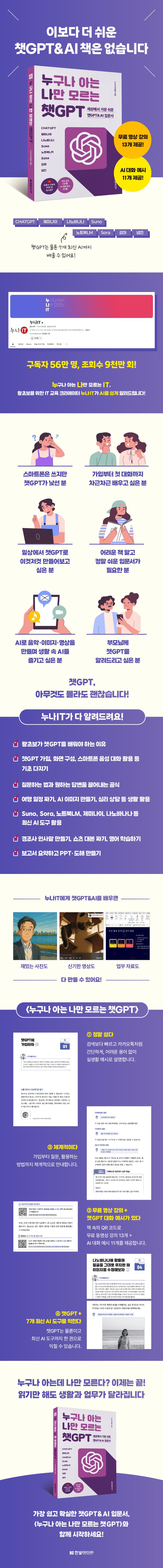 머리말챗GPT를왜배워야하나요?챗GPT왕초보를위한<누구나아는나만모르는챗GPT>학습내용미리보기책의구성살펴보기영상강의재생하기실습파일활용하기0장왕초보가챗GPT를배워야하는이유검색보다훨씬쉽다!단어를정확히몰라도정보를빠르게찾을수있어요카카오톡만큼간단하다카카오톡만큼쉬워서바로쓸수있어요타자가느리면음성으로물어본다통화하듯이,음성입력기능이있어요업무가훨씬빨라진다챗GPT는처리속도가빨라요물어볼사람이없을때,수백번도질문할수있다반복된질문에도친절한답변을하는똑똑한친구예요1장챗GPT시작전에꼭알아야하는다섯가지01챗GPT에가입하자크롬찾아서인터넷창열기챗GPT사이트접속하기챗GPT회원가입하기챗GPT무료vs유료버전차이알아보기[조금더가볼까요?]Plus플랜으로업그레이드하기(유료구독)[조금더가볼까요?]유료구독취소하기02챗GPT화면구성에익숙해지자기본화면구성익히기챗GPT빠르게불러오기(PC버전데스크톱앱설치)[1분만요!]챗GPT빠르게불러오는꿀팁03챗GPT와첫대화를시작하자어디서부터시작할까요?새채팅열어보기도구기능활용하여질문하기04스마트폰에서챗GPT를써보자모바일앱스토어에접속하고챗GPT설치하기챗GPT로그인하기[3분만요!]챗GPT쉽게시작하기05챗GPT와음성으로대화하자스마트폰으로챗GPT와대화하기대화하듯날씨물어보기음성대화내용확인하고다시질문하기2장쉽지만강력한챗GPT질문방법익히기01챗GPT에게질문해보자먼저‘너는누구야?’를물어보세요어떤주제로물어볼까요?02챗GPT에게구체적으로질문해보자질문은구체적일수록좋아요[조금더가볼까요?]구체적으로질문하기실전연습!03챗GPT에게원하는답변을끌어내는다섯가지방법하나,‘개인맞춤설정’을설정해요[조금더가볼까요?]챗GPT개인맞춤설정하기둘,챗GPT에게역할을부여해요셋,질문을질문해요넷,꼬리에꼬리를무는질문을해요다섯,예시를들어요[조금더가볼까요?]여전히챗GPT답변이마음에들지않는다면?3장일상이즐거워지는챗GPT활용능력키우기01챗GPT로여행을준비하자여행계획을세워봐요[조금더가볼까요?]여행일정짤때고려해야할다섯가지[챗GPT와의대화확인하기]제주도1박2일여행일정요청챗GPT에게여행사직원이라는역할을부여해요[조금더가볼까요?]맞춤형일정을짜는프롬프트꿀팁9박10일,장기여행에필요한짐을싸봐요[조금더가볼까요?]맞춤형짐싸기꿀팁[챗GPT와의대화확인하기]40대남성의9박10일유럽여행짐목록요청카카오톡으로여행일정공유하기[1분만요!]여행계획짜고카톡으로공유하기컴퓨터(데스크톱PC)에서공유하기02챗GPT로AI이미지를만들어보자AI이미지만들기,무료버전도가능해요지브리스타일로만들어줘![챗GPT와의대화확인하기]내사진을지브리스타일로만들기이미지를내스마트폰에저장하기이미지배경지우기다른스타일로바꿔보기바비인형포장스타일로만들어줘!액세서리,글자를넣을수도있어요이미지의글자수정하기[조금더가볼까요?]다양한이미지생성방법[조금더가볼까요?]이런이미지는어떻게만드나요?[3분만요!]지브리스타일뿐아니라다양한AI이미지만들기03챗GPT에게심리상담을받자챗GPT에게부부상담요청하기상담할때챗GPT를더잘써먹는노하우[1분만요!]챗GPT와심리상담하기[챗GPT와의대화확인하기]자녀와의대화방법요청4장챗GPT보다더재미있는AI툴써보기01Suno로생일축하노래를만들어선물하자음악을만드는Suno,가입하고로그인하기직접노래만들어보기원하는장르,스타일로만들어보기[조금더가볼까요?]음악을풍부하게만드는세가지옵션[조금더가볼까요?]Suno유료결제하기커스텀기능으로노래만들어보기노래다운로드하기카카오톡으로노래전송하기노래커버이미지바꾸기[3분만요!]SunoAI로생일축하노래만들기02챗GPT유료사용자라면Sora로살아움직이는영상을만들자챗GPT유료로업그레이드하기Sora에서만들고싶은영상스타일고르기챗GPT에서영상프롬프트를한글로번역하고문장수정하기Sora영상프롬프트입력하고옵션값수정하기만들어진영상다운로드하기[1분만요!]더멋진영상을만들기위한프롬프트활용법03구글노트북LM으로내가찾은자료를요약하고공유하자!노트북LM사용설정하기인터넷에서찾은자료를마인드맵으로요약하기인터넷에서찾은소스로대화하는팟캐스트만들기완성된AI오디오오버뷰를음성파일로다운로드하기[조금더가볼까요?]선택한소스를기반으로노트북LM에서채팅하기[1분만요!]마인드맵,AI오디오오버뷰소개04제미나이로유튜브영상분석하고@로구글서비스연결하기제미나이사용설정하기유튜브영상의핵심만뽑아빠르게요약,분석하기[조금더가볼까요?]유튜브영상요약에써먹을수있는프롬프트꿀팁@로제미나이와구글의모든서비스연결하기[조금더가볼까요?]바로실행할수있는구글서비스활용법05나노바나나를활용해얼굴을그대로유지한채이미지를수정해보자나노바나나가특별한이유스마트폰에제미나이앱설치하기음성으로이미지생성하고편집하기입고싶은옷을내사진에합성해서스타일확인하기[조금더가볼까요?]인물사진으로3D피규어이미지만들기[조금더가볼까요?]제미나이에서프롬프트를더잘만들수있는꿀팁[3분만요!]나노바나나소개5장챗GPT로콘텐츠만들어활용하기01원하는스타일로