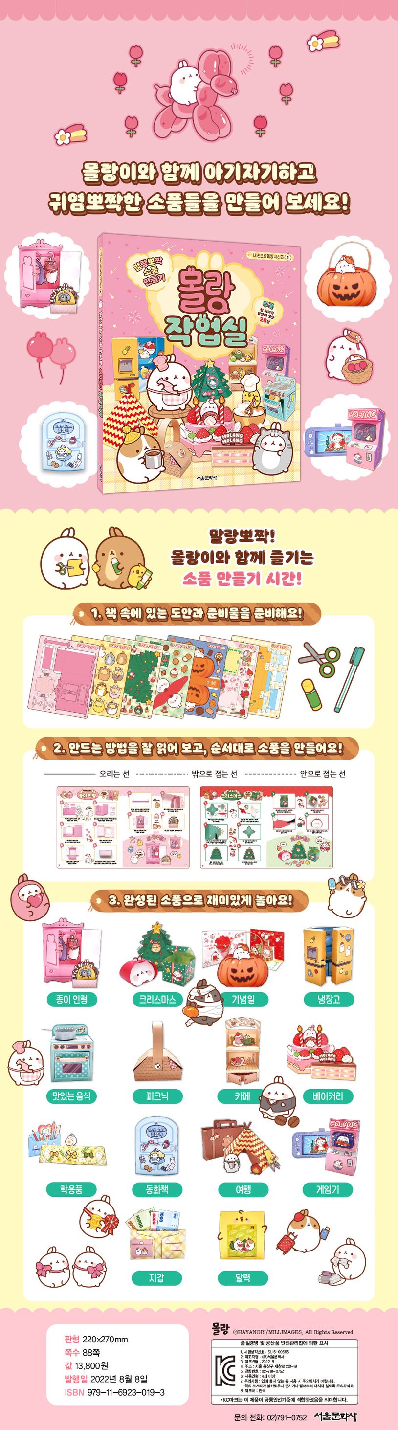 〈말랑뽀짝 소품 만들기: 몰랑 작업실〉 속 만드는 방법을 잘 읽어 보고, 순서대로 소품을 만들어요. 도안을 오리고, 접고, 붙이면 나만의 말랑뽀짝 몰랑이 소품을 만들 수 있어요! 왕 귀여운 몰랑이 도안이 28장이나 들어 있어요!