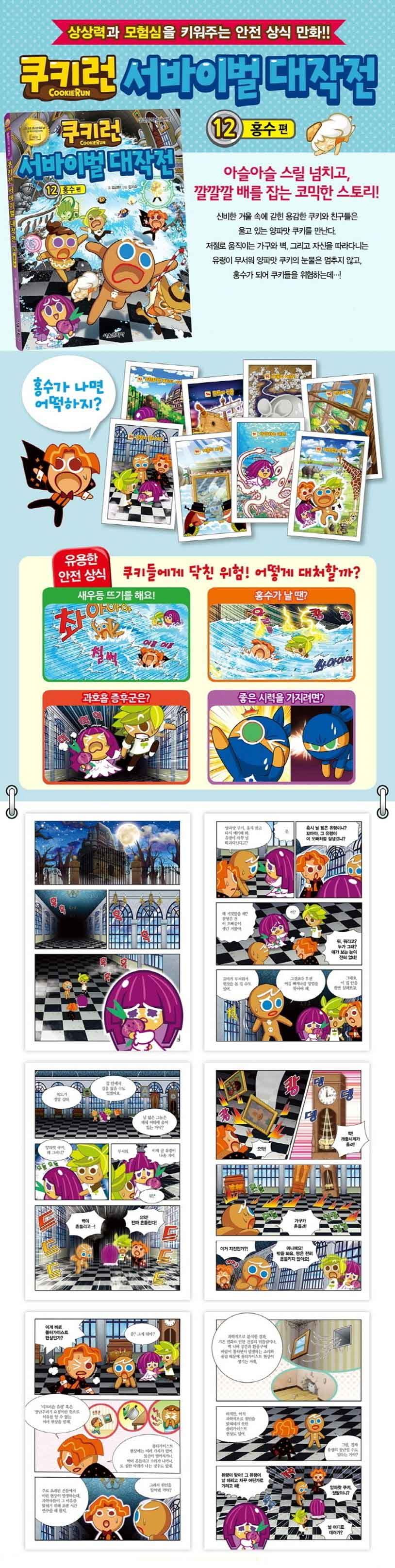 안전상식 학습만화 「쿠키런 서바이벌 대작전」 제12권 《홍수 편》. 신비한 거울 속에 갇힌 용감한 쿠키와 친구들은 울고 있는 양파맛 쿠키를 만난다. 저절로 움직이는 가구와 벽, 그리고 자신을 따라다니는 유령이 무서워 양파맛 쿠키의 눈물은 멈추지 않고, 홍수가 되어 쿠키들을 위협하는데…!
