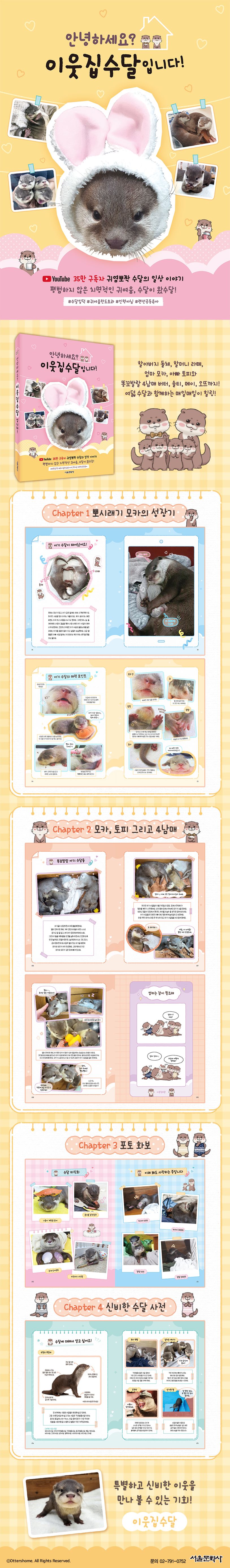 할아버지 돌체, 할머니 라떼, 엄마 모카, 아빠 토피와 똥꼬발랄 4남매 버터, 솔티, 메이, 오뜨까지! 여덟 수달과 함께하는 매일매일이 힐링! 특별하고 신비한 이웃을 만나 볼 수 있는 기회! 귀염뽀짝 수달 가족들의 사진이 가득! 귀여운 일러스트와 함께 이웃집수달의 아기자기한 이야기 속에 폭 빠져 보세요!