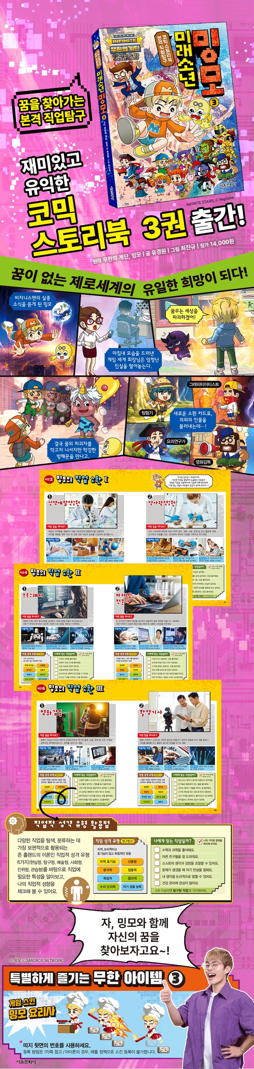 〈무한의 계단 미래소년 밍모〉는 꿈을 찾아가는 어린이들에게 세상에 존재하는 많은 직업에 대해 소개하고자 기획하였습니다. 무엇보다 어린이들이 흥미롭고 재미있게 읽을 수 있도록 다양한 직업군을 상징하는 캐릭터들이 존재하는 무한의 계단 게임을 배경으로 인기 모바일 게임 크리에이터 밍모를 주인공으로 내세워 이야기를 풀어냈습니다.