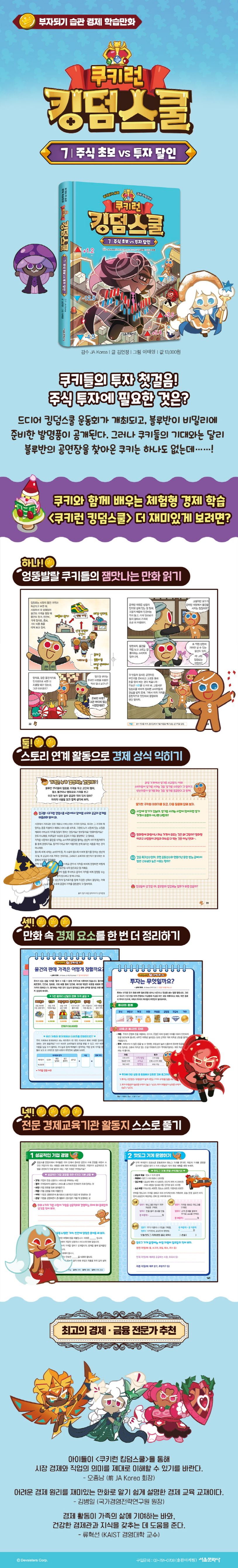 또한 〈쿠키런 킹덤스쿨〉은 개념을 외우듯 배우는 경제가 아닌, 체험하고 놀이하듯 경제를 몸소 익히는 학습만화입니다. 실제 생활 속의 다양한 경제 활동을 쿠키들의 일상 묘사로 자연스럽게 연출하여 책을 읽는 아이들이 간접적으로 경제를 배울 수 있도록 하였고, 스토리 속의 놀이 활동과 학습 활동을 통해 나와 우리 가족, 친구와 이웃들은 어떤 경제생활을 하는지 스스로 사고할 수 있습니다.