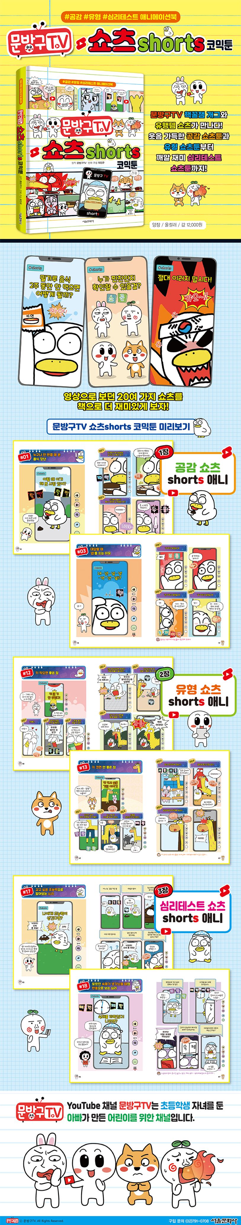 이 책은 문방구TV 영상툰의 대표 주제인 공감과 유형 이야기, 그리고 엉뚱 심리테스트 쇼츠를 수록한 것으로, 1분 미만의 코믹 쇼츠 영상을 책 속에 그대로 표현하였습니다. 또한 기존의 코믹툰 시리즈에 표현된 가로형 만화 장면에서 벗어나 세로형으로 장면을 구성함으로써 보는 재미를 더했습니다.