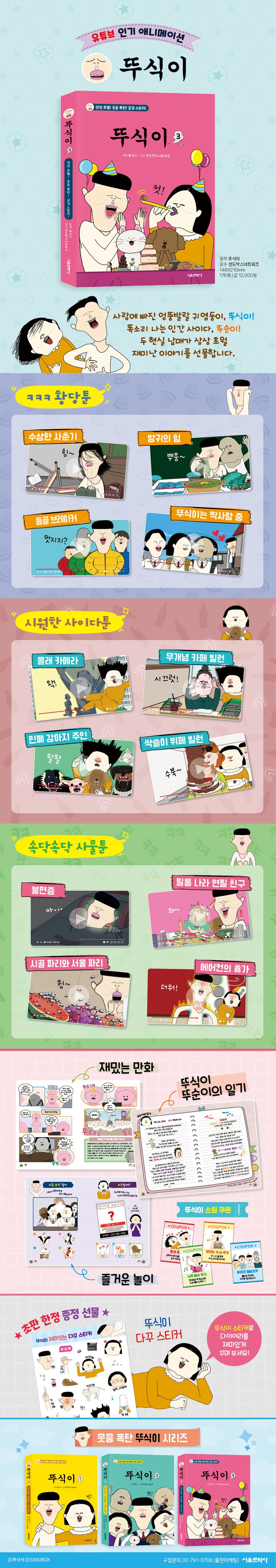 일상에서 벌어지는 황당하고 웃긴 이야기부터 생활 속 빌런을 시원하게 혼내 주는 유쾌한 이야기까지! 볼수록 빠져드는 뚜식이, 뚜순이 남매의 상상 초월 웃음 폭탄 세 번째 이야기를 기대해 주세요. 재미있는 만화 뒤에는 뚜식이, 뚜순이가 전하는 엉뚱하고 유쾌한 고민 해결 팁도 소개됩니다.